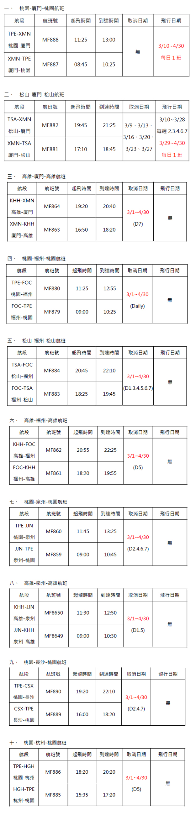 廈門航空-2020年3-4月航班異動