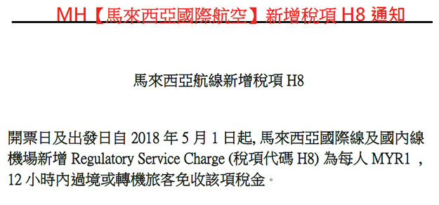 馬來西亞國際航空-馬來西亞航線新增稅項(H8)通知