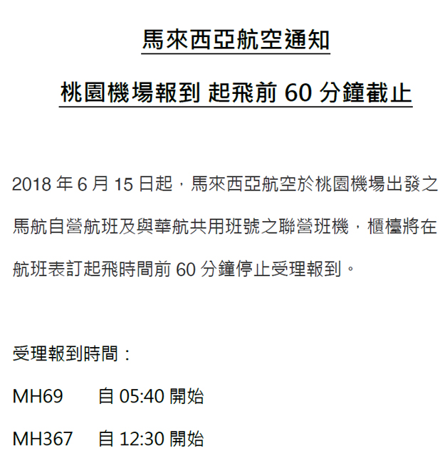 馬來西亞國際航空-班機起飛前60分停止受理報到