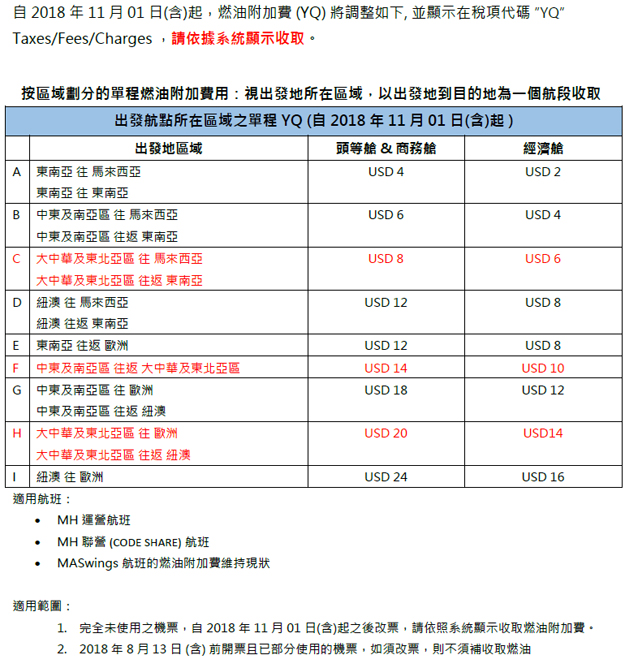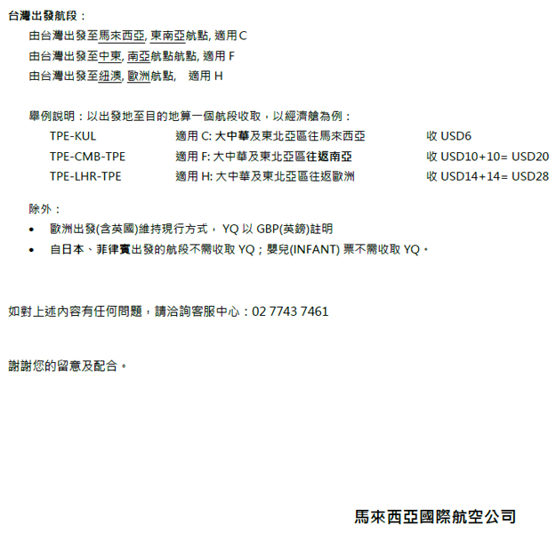 馬來西亞國際航空-調整燃油附加費YQ通知