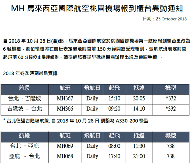馬來西亞國際航空-桃園國際機場報到櫃台異動通知