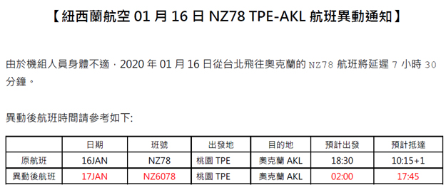 紐西蘭航空-航班異動通知