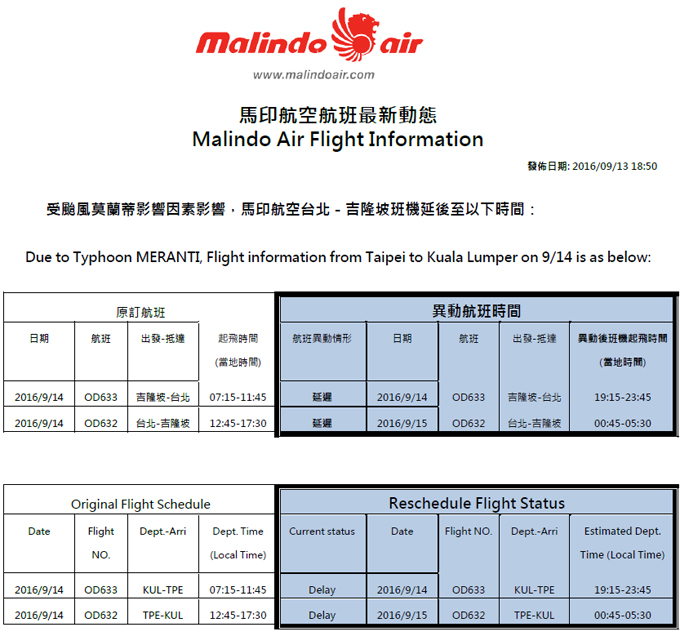 9/14 班機延遲公告 Flight OD633 TPE/KUL