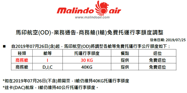 馬印航空-商務艙 ( I 艙) 免費托運行李額度改為30公斤