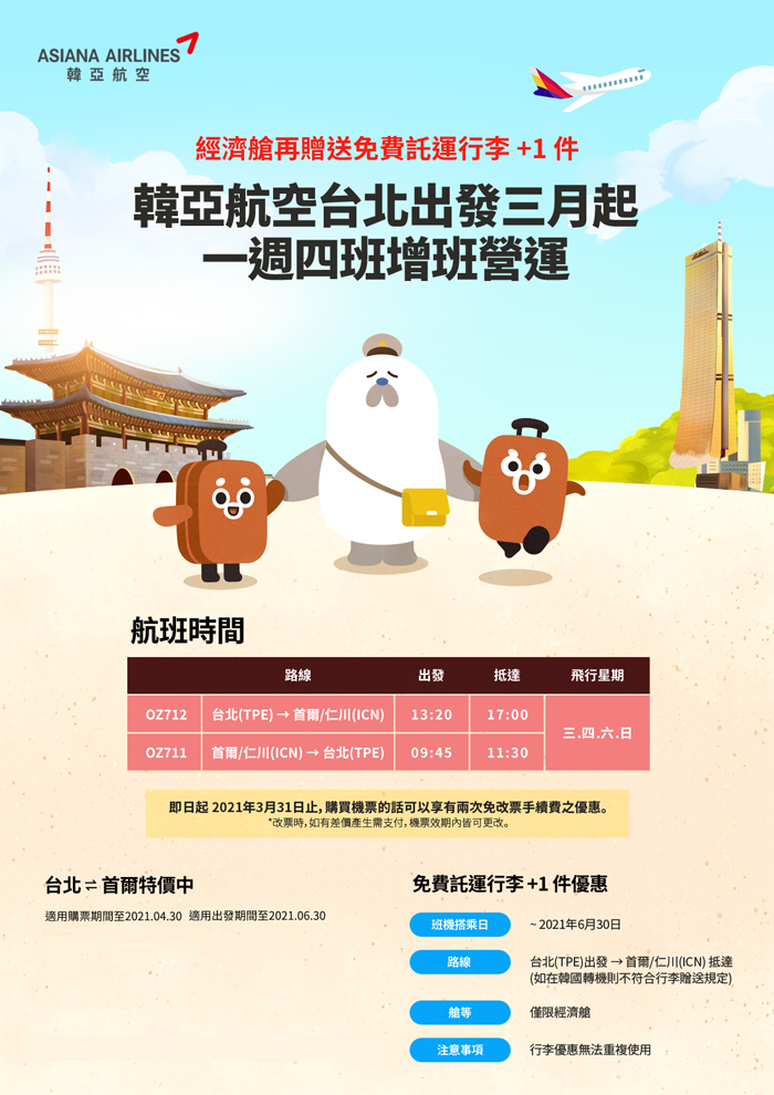 國際機票優惠快訊 ✈ 韓亞航空春季優惠 免費托運行李+1
