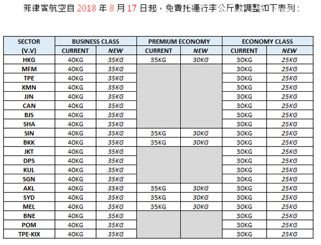 菲律賓航空-調整免費托運行李公斤數