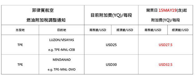 菲律賓航空-調漲由台灣出發客運燃油附加費