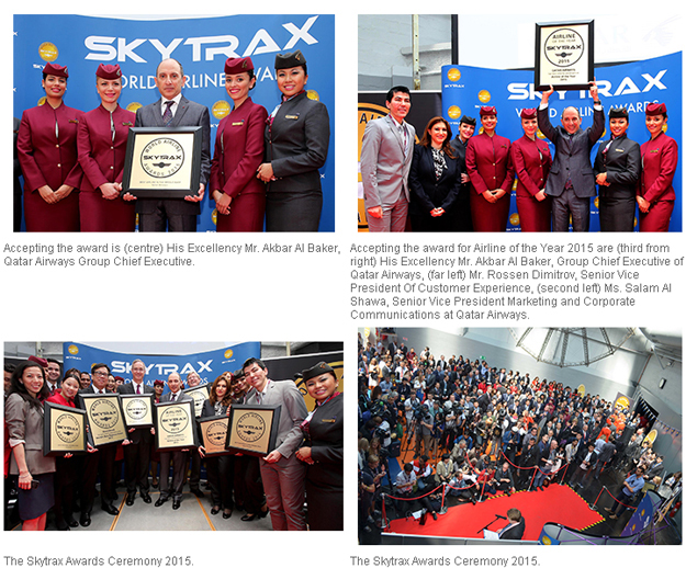 國際航空服務調查機構Skytrax公布2015年度航空界奧斯卡大獎- 全球最佳航空公司獎,冠軍由卡達航空獲得! Skytrax主辦的全球航空公司大獎極具公信力,被視為全世界航空公司顧客滿意度的基準,這份調查透過來自全球110個國家共有1890萬名乘客針對飛機點餐、座位舒適程度及空服員友善程度等要素進行票選。今年奪得第一名的卡達航空,是Skytrax全球最佳航空獎這項票選的常勝軍,在2011和2012年都曾拿下冠軍,而在去年則排名第二。除此之外,卡達航空也拿下最佳商務艙座椅(Best Business Class Airline Seat)以及中東地區最佳航空公司(Best Airline in the Middle East)。