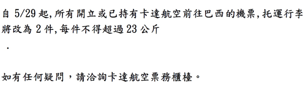 卡達國際航空-經濟艙往返巴西行李公斤數調整