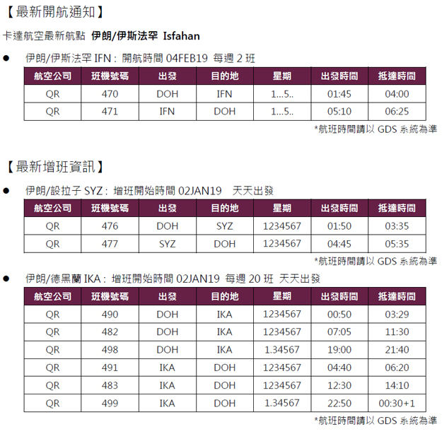 卡達國際航空-伊朗 伊斯法罕 Isfahan (IFN) 04FEB19 開航公告