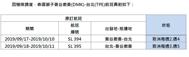 泰國獅子航空-航班異動通知