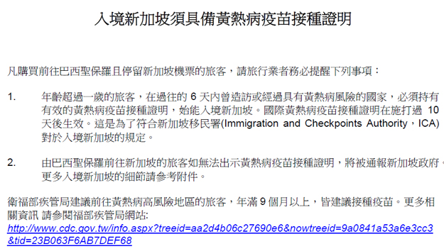 新加坡航空-入境新加坡須具備黃熱病疫苗接種證明
