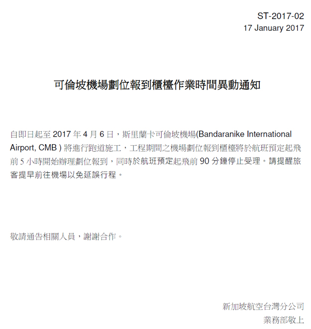 新加坡航空-可倫坡機場劃位報到櫃劃位時間異動