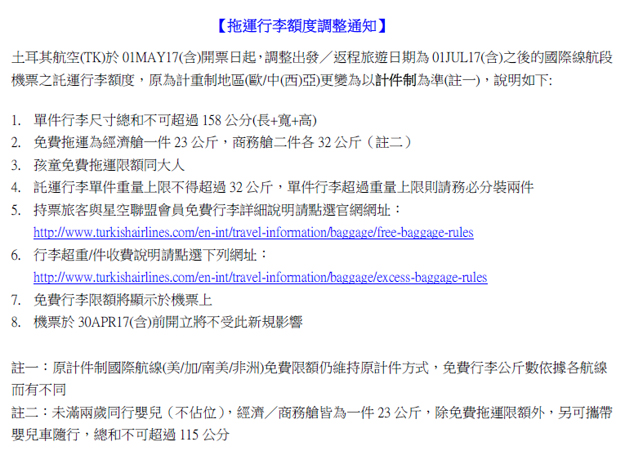 土耳其航空-拖運行李額度調整通知