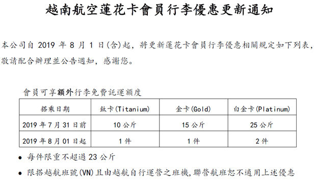 越南航空-蓮花卡會員行李優惠規定更新通知