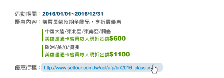 - 本專案需持卡人主動告知東南旅遊使用美國運通卡優惠,限美國運通卡會員本人使用,並須以刷卡支付整筆團費方可享有此優惠。