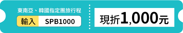 活動內容:活動期間刷永豐銀行信用卡購買東南旅遊【東南亞或韓國指定行程】並分期,輸入專屬折扣碼SPB1000,即可享有現折1000元,限每筆訂單現折乙次。