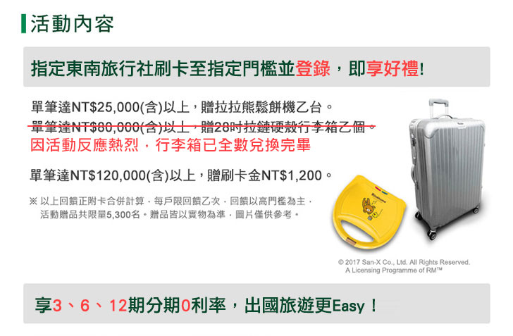 - 參加本活動指定旅遊商品,每卡可獲贈贈品「多功能行李收納包」乙份,限量300份,送完為止,贈品隨機出貨,恕不挑色,亦不得要求轉換或折換現金,領取方式請依東南旅行社活動網頁公告為準。