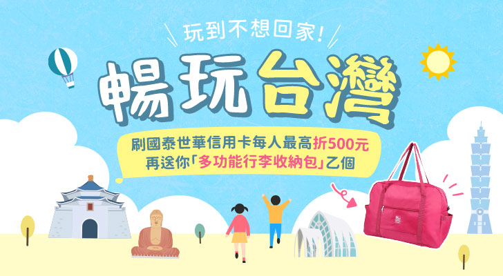 國泰世華銀行卡友獨享購買指定環島巴士、和運假期、國內訂房行程,每人最高享500元折扣,