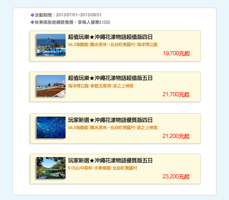- 專案適用出發日期:2013/08/01~2013/09/30止;以上優惠僅限佔床者,不得與其他優惠專案合併使用。