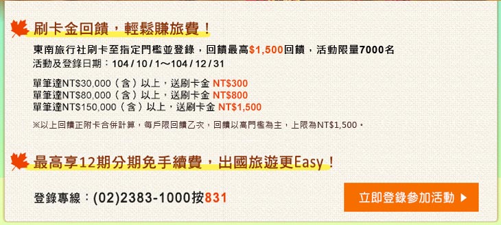 - 本活動所贈送之刷卡金,正附卡消費合併計算(不適用「商務卡、亞洲萬里通聯名卡、虛擬卡」等卡片),須限於東南旅行社,且需刷本行卡之一般消費金額,方可獲得,由正卡持卡人取得贈品兌獎資格。上述活動所贈送之刷卡金於活動結束後由本行回饋 於卡友,每戶限回饋乙次,並以高門檻為準(每戶回饋上限NT$1,500)。(EX:活動期間同一持卡人單筆消費NT$150,000及單筆消費NT$80,000共兩筆,將回饋NT$1,500刷卡金。)