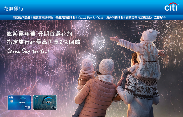 - 各旅行社分期適用之行程或期數,請詳依各旅行社公告為主。本活動符合回饋資格之訂單須成功刷花旗信用卡付款且未退貨始可具有回饋資格,若付款失敗、交易取消、退貨,該筆交易不得參加本活動。