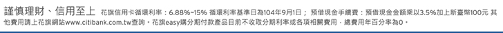 花旗easy購分期付款產品A.計算範例:分期帳款金額10萬元,分期期數12期。惟持卡人如遲誤繳款期限或未於每月繳款截止日前付清當期最低應繳金額,本行將依信用卡約定條款收取遲延利息以及滯納金。B.本廣告揭露之年百分率係按主管機關備查之標準計算範例予以計算,實際條件,仍以銀行提供之產品為準。且每一客戶實際之年百分率仍視其個別產品及個人信用狀況而有所不同。C. 本總費用年百分率之計算基準日為101年5月10日。