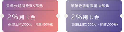 活動期間內於指定旅行社單筆分期消費滿額,達以下門檻且完成登錄,可享有每月最高2% 刷卡金回饋2,活動期間最高可享6000元刷卡金回饋!