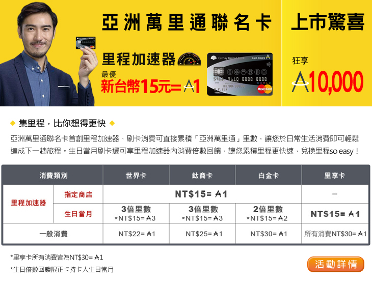 - 持國泰世華「亞洲萬里通」聯名卡刷卡消費可累積里程點數,累積之里程點數可轉換成「亞洲萬里通」里數。聯名世界卡、鈦商卡、白金卡享有里程加速器類商店,每滿NT$15刷卡消費可累積1里程點數;其他一般消費則依卡級不同,世界卡享有每滿NT$22刷卡消費可累積1里程點數,鈦商卡享有每滿NT$25刷卡消費可累積1里程點數,白金卡享有每滿NT$30刷卡消費可累積1里程點數。里享卡不提供里程加速器,所有消費皆為每滿NT$30刷卡消費可累積1里程點數。