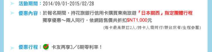 - 優惠專案報名期間為2014/09/01~2015/02/28止;優惠內容限專案期間內報名且出發之指定團體行程方適用,不得與其他優惠專案合併使用。