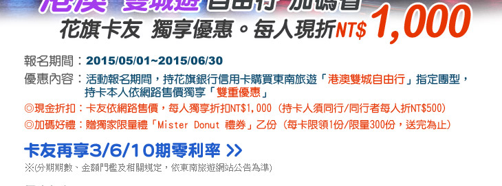 - 本專案需持卡人主動告知東南旅遊使用花旗銀行信用卡優惠,並以花旗銀行信用卡刷付本人及同行者之全額費用方可享有,每卡優惠限刷卡本人享折扣NT$1,000,同行者每人折扣$500(嬰兒除外)。