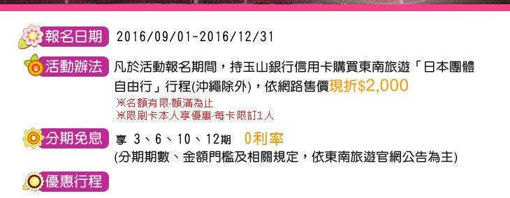 - 需持玉山Unicard於東南旅遊刷卡消費(含綁定Apple Pay、Google Pay、Samsung Pay),始符合回饋資格,使用第三方支付,如 Pi 拍錢包、街口支付、LinePay、歐付寶…等,恕不適用上述活動回饋。