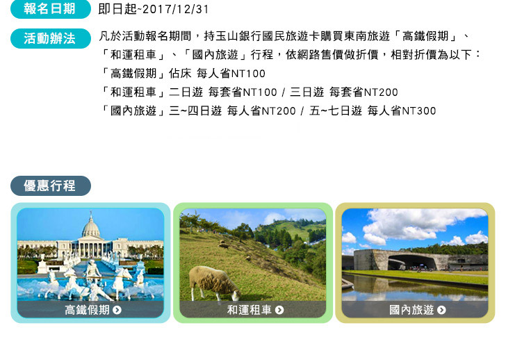 - 本專案符資格之玉山卡友需主動告東南旅遊使用本專案優惠。