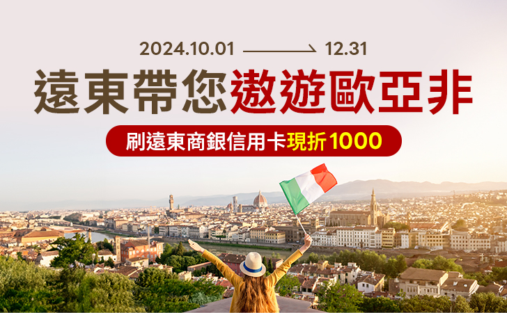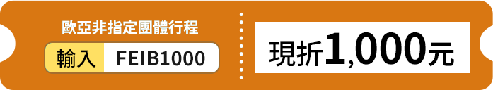 活動內容:活動期間刷遠東商銀信用卡購買東南旅遊【歐亞非指定行程】,輸入專屬折扣碼FEIB1000,即可享有現折1,000元,限每筆訂單現折乙次。