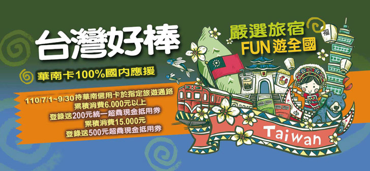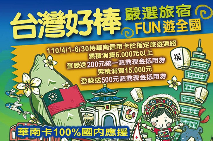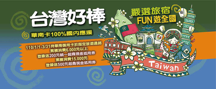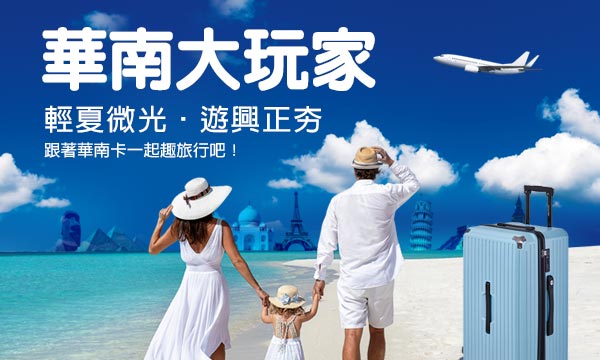 - ※限於指定旅通路現場或官方網站訂購且使用華南卡付款適用,透過非指定通路代售行程、訂房不適用本活動(如購物網站販售之行程/訂房)。