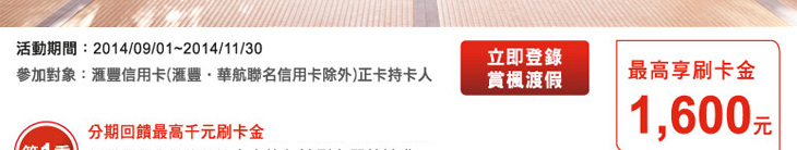 - 2. 回饋參加辦法: 正卡持卡人須於活動期間(2014.9.01~2014.11.30)內,至本行活動網頁(www.hsbc.com.tw/14fall)完成登錄;即可拿: