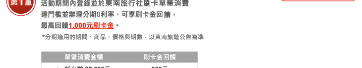【第1重回饋】:活動期間內於東南旅行社刷滙豐信用卡消費單筆分期金額滿新臺幣(以下同)25,000元(含)以上,可獲贈刷卡金300元;50,000元(含)以上可獲贈刷卡金600元;80,000元(含)以上可獲贈刷卡金1000元。活動期間每位正卡持卡人限回饋一次,附卡之消費併入正卡計算,最高回饋上限1,000元。但若使用中華航空網路購票並拿機票折扣優惠交易,恕無法使用分期0利率優惠。