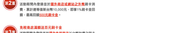 【第2重回饋】:活動期間內於國外商店或網站以滙豐信用卡刷卡之外幣消費,消費累計達等值新台幣10,000元以上,即享刷卡金額1%之刷卡金回饋,附卡之消費併入正卡計算,活動期間最高回饋刷卡金500元。國外商店或網站之外幣消費係指交易商店之國別非台灣地區且交易幣別非新台幣之一般交易,惟不含預借現金,飛機上消費,旅行支票和賭場取現等交易,國外交易手續費不得列入計算,且僅計算刷卡消費折合台幣之金額。