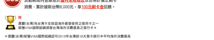 【第3重回饋】:活動期間內於國內免稅商店以台幣計價之消費累計達新台幣8,000元,即拿100元刷卡金回饋,附卡之消費併入正卡計算,活動期間每位正卡持卡人限回饋一次。國內免稅商店依國際組織定義之免稅商店為準。