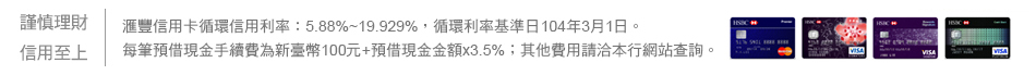 - 10.滙豐銀行保留最終核准信用卡分期付款與否及決定分期付款金額、期數等之權利。其他未盡事項悉依滙豐銀行「特約商店分期付款注意事項」及「信用卡約定條款」辦理,信用卡分期注意事項之詳情及其他限制條件,請至滙豐銀行網站http://www.hsbc.com.tw查詢。
