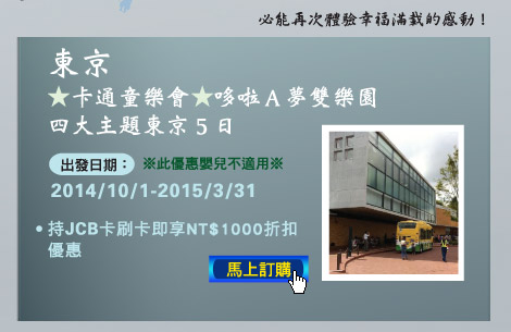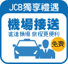 - 上述優惠價皆已含兩地機場稅、燃油費及安全檢查費,另含履約責任險每人500萬元與20萬元意外醫療險。本活動不限持卡人本人使用,凡以JCB信用卡刷卡支付本行程之他人團費,即可享優惠刷卡價。
