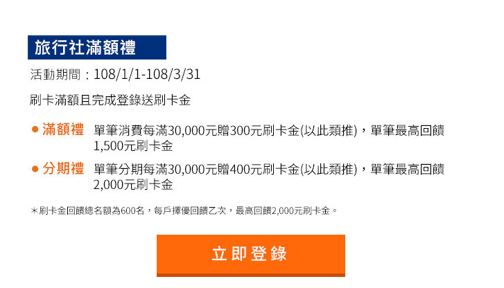 - 分期累積滿30,000元加碼贈刷卡金300元