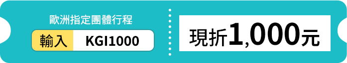 活動內容:活動期間刷凱基信用卡購買東南旅遊【歐洲指定行程】,輸入專屬折扣碼KGI1000,即可享有現折1,000元,限每筆訂單現折乙次。