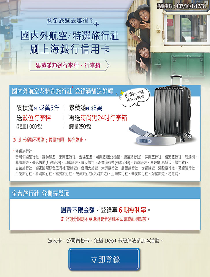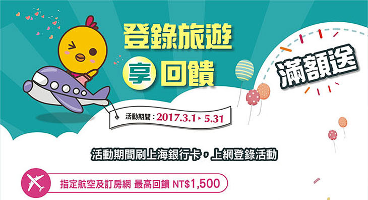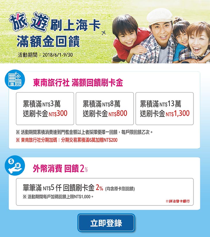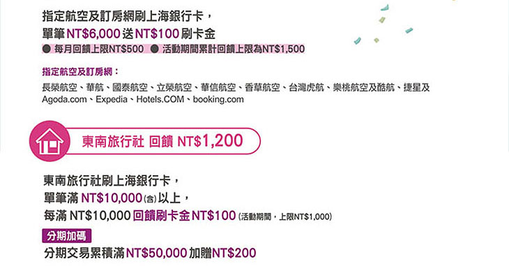 活動期間持上海信用卡於東南旅遊消費滿額並登錄,可享: