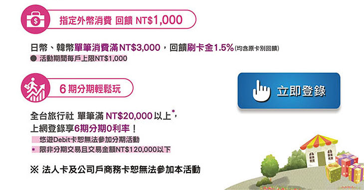 2. 持卡人需於活動期間至本行官網登錄參加本活動,始符合回饋資格,完成登錄者視為同意本活動內容與注意事項,逾期未完成登錄者,不具回饋資格,無法補登。v