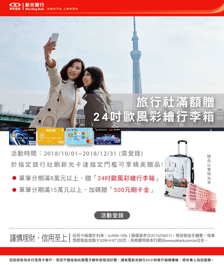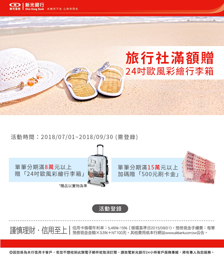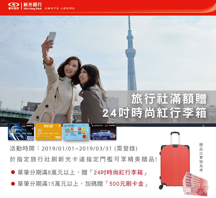 - 本活動於指定旅遊通路消費,因店家授權交易至請款入帳之間有時間差,故活動期間內恕無法提前告知是否於回饋名單內,活動回饋名單以新光銀行於活動結束後計算之實際回饋資格為準。