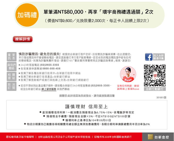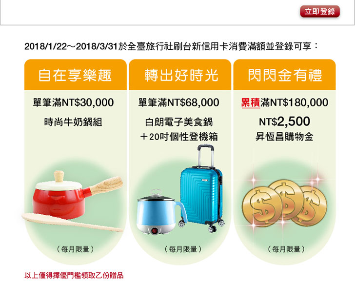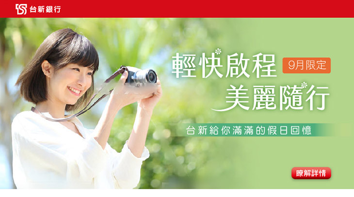 - 本活動需自即日起~2017/9/30於台新銀行官網或來電客服完成本活動參加資格登錄作業,方為有效。逾期未登錄或登錄未成功者,視同放棄,恕不得要求補登參加或變更回饋內容。