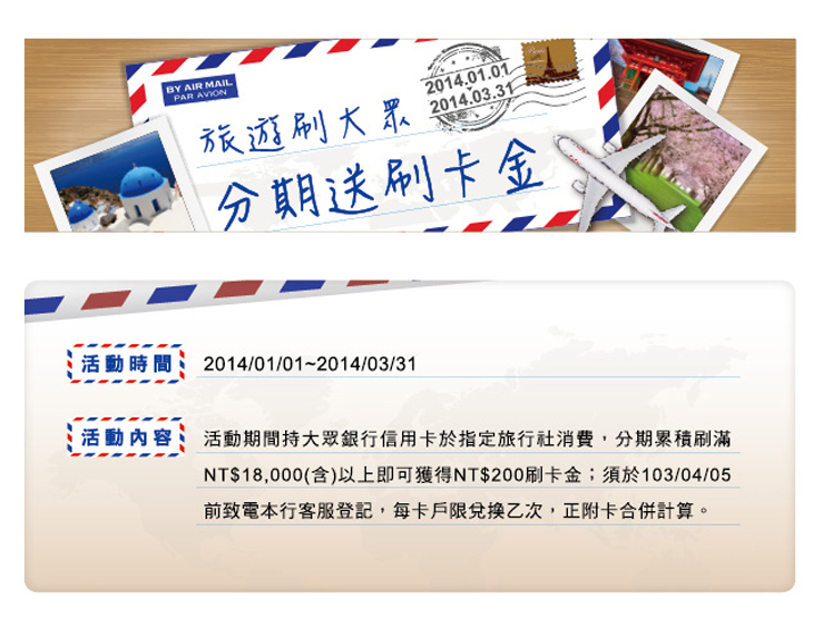 - 消費計算以活動期間2014/01/01~2014/03/31內交易日為準,入帳日期計算至2014/04/07,大眾銀行不負擔因商店逾期請款所造成之損失。如有退貨或列入爭議款,則該筆交易不列入計算。
