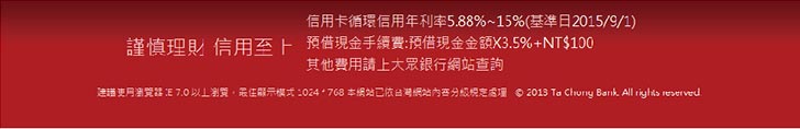 - 本活動消費分期利率為零、零手續費以及總費用年百分率為零。大眾銀行不會就本活動之分期付款交易向持卡人額外收取分期手續費或分期利息。