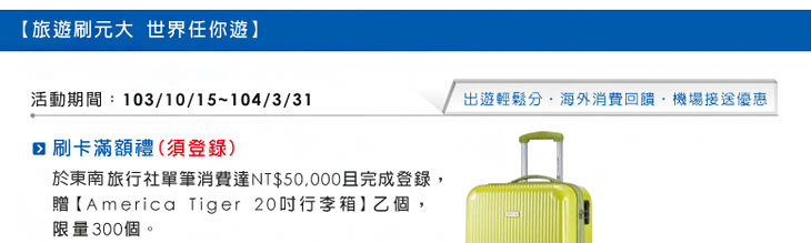 - 「America Tiger 20吋行李箱」限量300個,於配送時依登錄順序前300名且符合消費門檻計算者為限,每位持卡人限領取乙次,將於符合活動資格後之次月批次寄送至正卡持卡人帳單地址。配送時如遇持卡人有停卡、逾期繳款或其他違反信用卡約定條款之情形,即喪失本活動回饋資格。